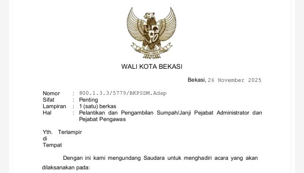Beredarnya surat undangan dari BKPSDM Kota Bekasi dengan Nomor 800.1.3.3/5779/BKPSDM.Adap, tertanggal 26 November 2025, semakin menguatkan rencana rotasi tersebut. Dalam surat dengan sifat Pentingdan lampira 1 (satu) berkas itu, seluruh pejabat administrator dan pengawas yang namanya tercantum diminta hadir dalam kegiatan pelantikan.