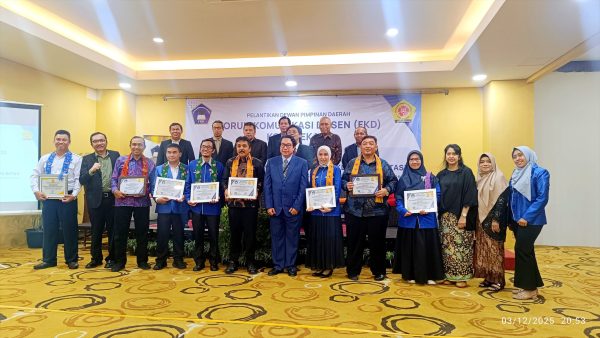 potretkita.com, Kota Bekasi – Forum Komunikasi Dosen (FKD) Indonesia menggelar Seminar Nasional bertema “Sinergi Forum Komunikasi Dosen Tanpa Batas. Peran Penelitian, Inovasi, dan Aplikasi Berkelanjutan dengan Kolaborasi Perguruan Tinggi, Pemerintah dan Industri untuk Riset Berdampak” dalam rangkaian pelantikan Pengurus DPW FKD Kota Bekasi di Hotel Merapi Merbabu, Rabu (3/12/2025).