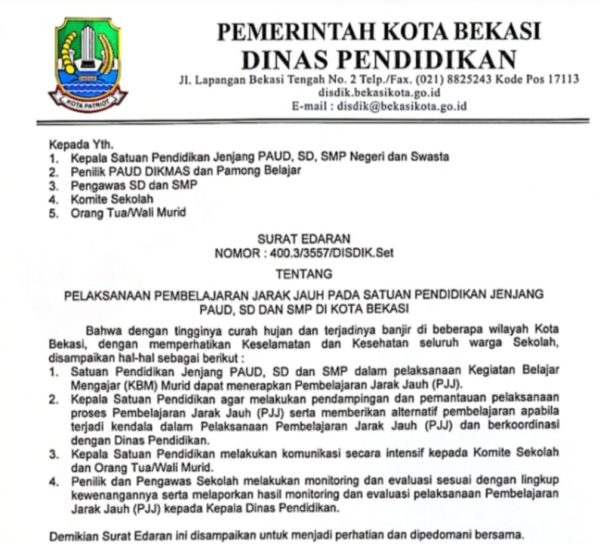 potretkita.com, Kota Bekasi – Pemerintah Kota Bekasi melalui Dinas Pendidikan resmi mengeluarkan Surat Edaran Nomor 400.3/3557/DISDIK.Set tentang pelaksanaan Pembelajaran Jarak Jauh (PJJ) pada satuan pendidikan jenjang PAUD, SD, dan SMP, baik negeri maupun swasta. Kebijakan ini diambil sebagai langkah antisipatif menyusul tingginya curah hujan dan terjadinya banjir di sejumlah wilayah Kota Bekasi.