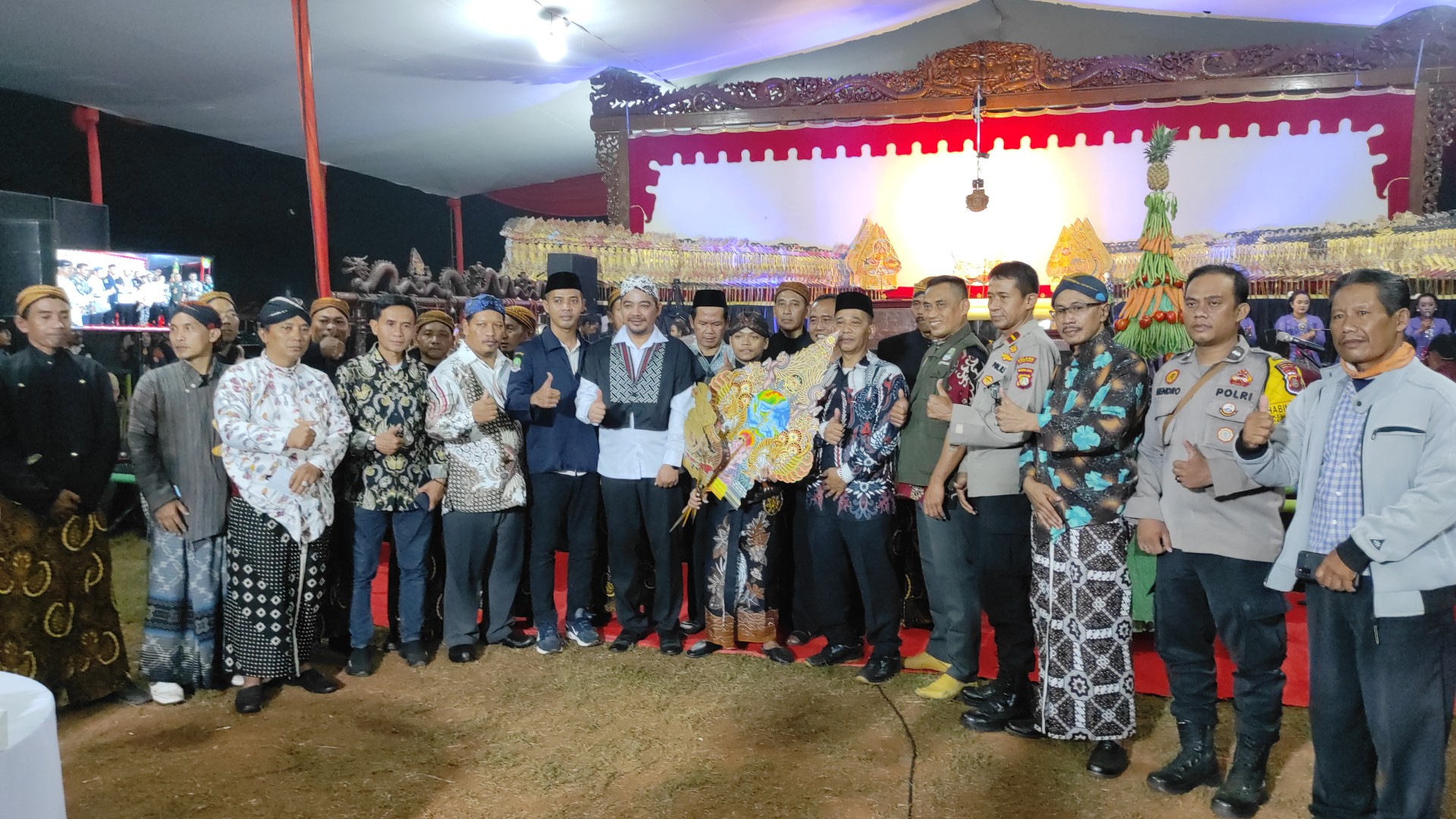 “Untuk malam ini hanya pagelaran wayang kulit saja ,dalangnya bocah yang sedang viral dan Penomenal dari Jogjakarta. Maka malam ini kita ambil judul lakon Semar bangun kayangan.bagaimana Semar ini membikin sebuah peradaban atau lingkungan itu menjadi damai adem dan tertata seluruh masyarakat terayomi,” pungkasnya