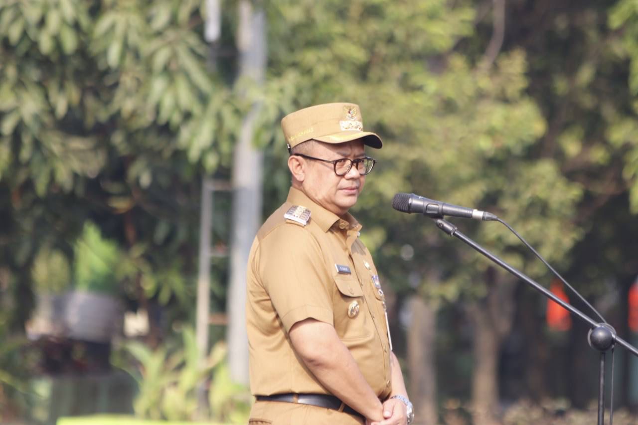 Photo:Pj, Wali Kota Bekasi R Gani Muhamad saat mempimpin Apel pagi gabung aparatur pemerintah Kota Bekasi.