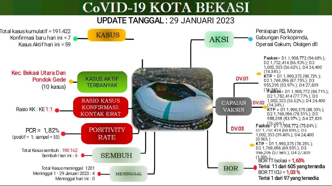 Untuk capaian Vaksinasi di Kota Bekasi dilaporkan per tanggal 29 Januari 2023 juga mengalami peningkatan, sebagai berikut ;