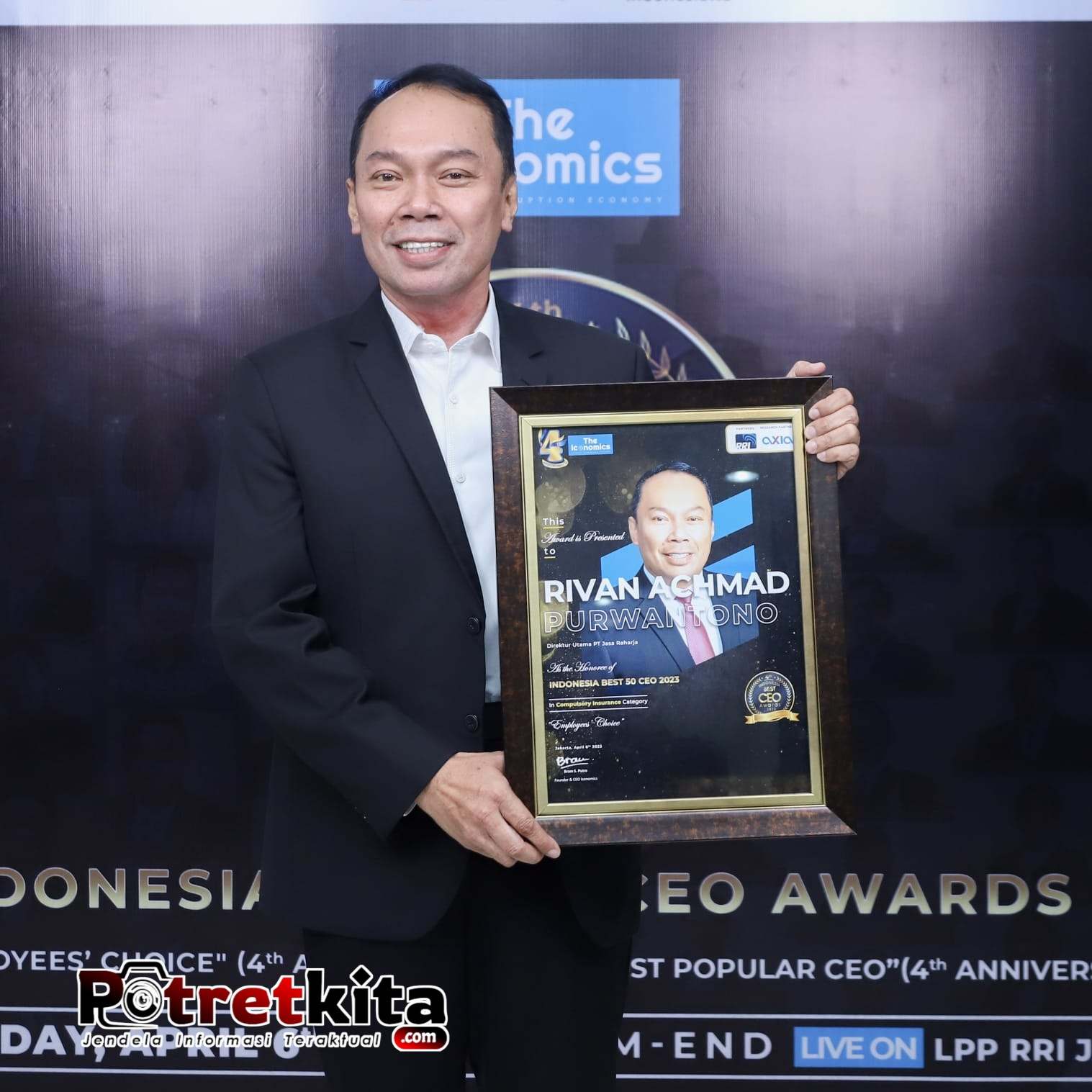 Direktur Utama Jasa Raharja Rivan A. Purwantono dinobatkan sebagai chiefexecutive officer(CEO) terbaik dalam ajang Indonesia Best 50 CEO 2023 kategoriCompulsory Insurance, yang digelar The Iconomics, Kamis (6/4/2023).